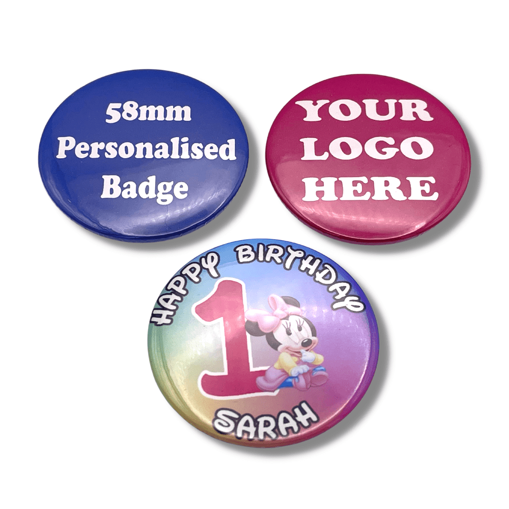 58mm Personalised Badges made from a metal front with a plastic backing with a safety pin for attachment.
